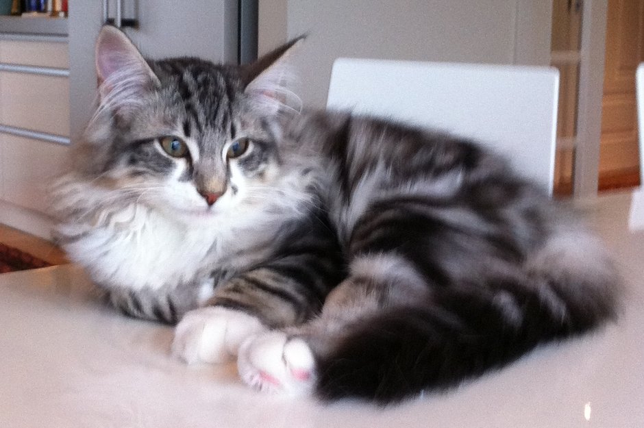 Han er 9 mnd og veier ca 2 kg. Lang pels og bustete, stor hale. En liten mørk flekk til venstre for snuten. Hvite poter og hvit på brystet.