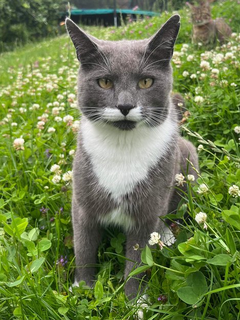 Katten er grå, med hvit «bart», hvite poter og hvit mage. Han har tatovering i øret, og er chippet og kastrert.