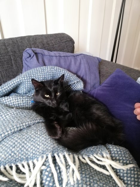 Helt sort, med et tydelig blått halsbånd med en liten bjelle på.