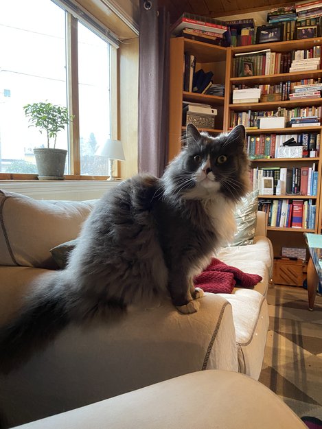 Han har ravgule øyne, og nesetippen er halvt rosa og halvt sort. Vi har nettopp klippet av pelsknuter, så han har kortere pels på sidene av kroppen, mot bakparten.