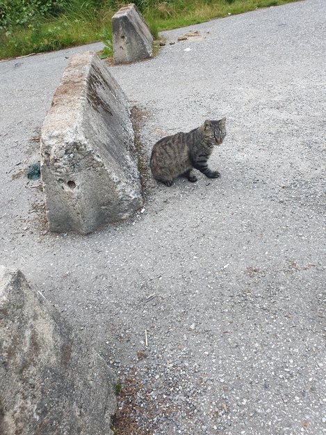 Liten katt med masse flott på seg. Gråbrun med sorte striper.veldig kosete