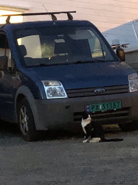 Stor sort katt med hvitt bles og hake/kjeveparti, krage og bryst. Lange hvite sokker på bakbeina, korte hvite sokker på frembeina. Sky. Løper bort når vi går i døren, men sitter og betrakter oss på avstand.