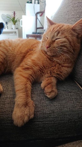 Skipskatt. Er litt over ett år gammel, litt stor for alderen. Tam og menneskevant, men kan virke sky ute.