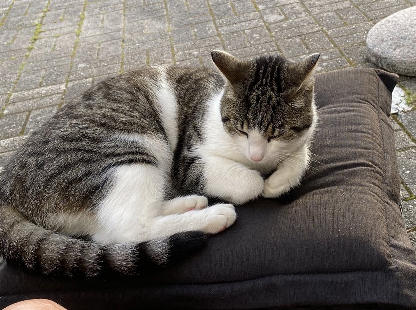 Katten dukket opp på gården lørdag 1.8. Den har vært her hver dag siden. Ser relativ ung ut, sunn og frisk og kjælen.