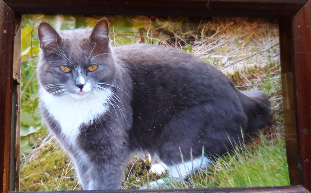 Han er 11 år,men en tynn og liten hannkatt. Har litt taggete ører. Svart snute.