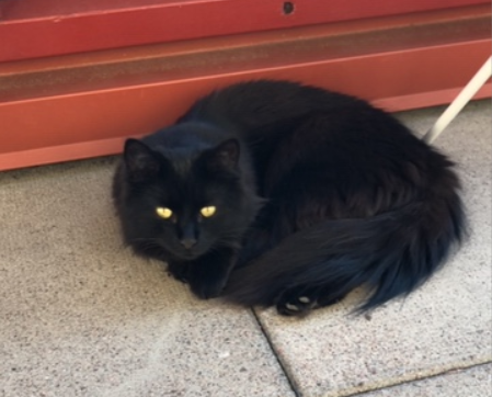 Helsort hunnkatt. Når solen lyser på henne så kan hun se ut som som sjokoladebrun. Medium/langhåret. Har ganske lang og fløffi hale.