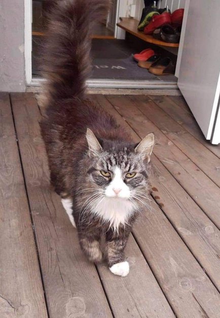 Den har tatt bolig hos oss, sover i hekkene, er hos oss hver dag. Spiser hundematen osv.