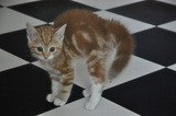 Ganske liten, er bare ca 11 mnd. Hvitt bryst. Kosete og uredd, vant til hunder.
