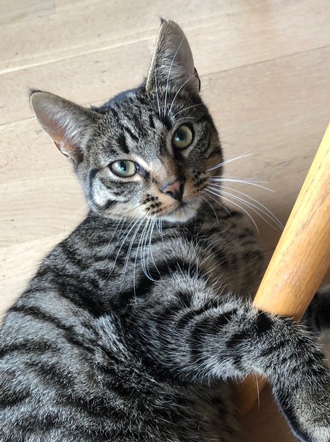 Venstre øre har et lite hakk. Han er sosial og liten av vekst.