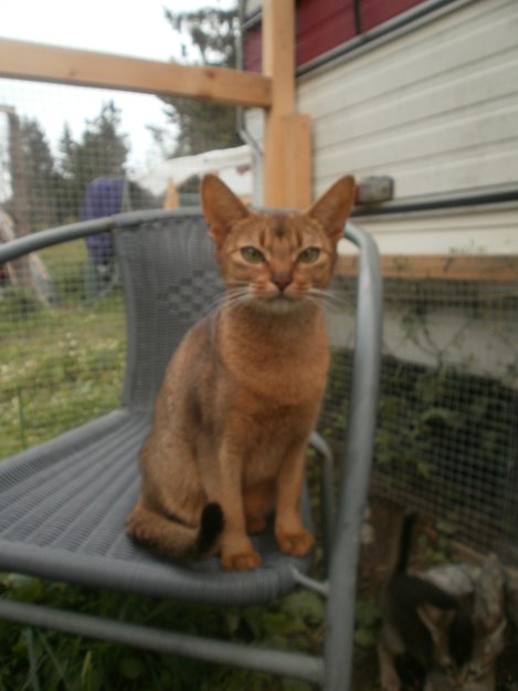 "Ticked" pels, mørk stripe på ryggen og svart haletipp, svarte potesålar, kvit under haka. Veldig tillitsfull og sosial. Liten, ca 3kg.