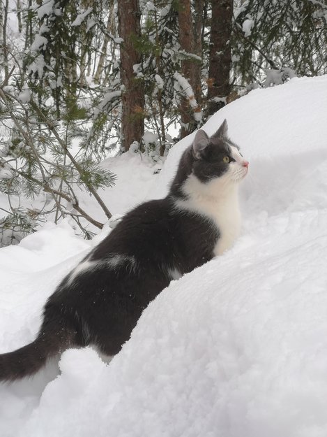 Mellomstor hankatt på litt over ett år. Kastrert, men ikke chippet. Blågrå, ikke striper, kun svak antydning til dette på halen. Litt lysere enn på bildet. Pelsen er littegrann lengre enn på helt korthårede og han har en hvit "fugl" på ryggen. Hvit under. Han er antagelig ganske tynn nå, det pleier han å være når han har vært på tur og kommer hjem for å fete seg opp igjen. Litt sky mot fremmede, men veldig kontaktsøkende og pratsom mot husets folk.
