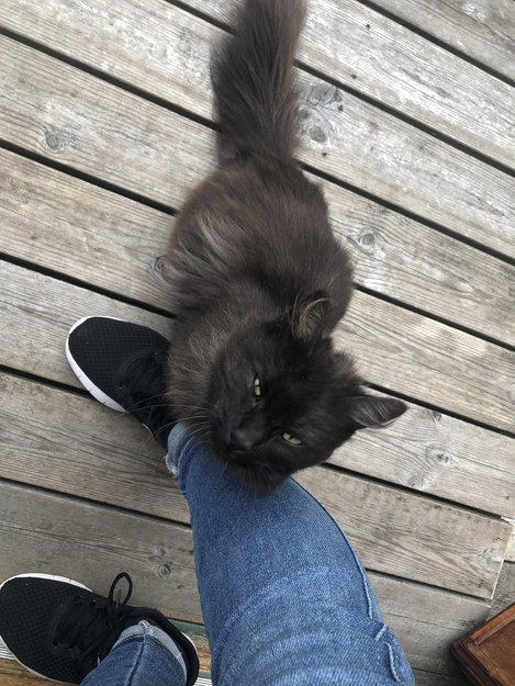 Katten virker sulten, pratesyk og kosesyk. Har observert katten før. En del flått på bakhodet. Katten har svart pels med grå underpels og grønne øyne. Vi tror det er en hannkatt men ikke helt sikker.