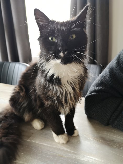 Svart og hvit. Ujevn pels pga klipp tidligere i år. Får mye flått.