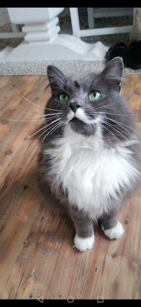 Grå, langhåret katt. Har hvit "melkebart" og hvitt på brystet.
