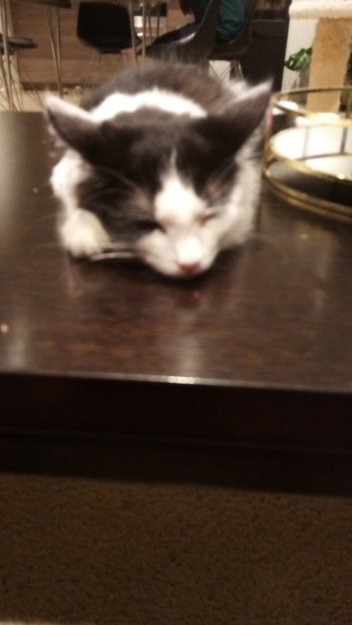 Hvit bryst, svart hale. Veldig stor for alder. Ser heller ut som 8/9 mnd