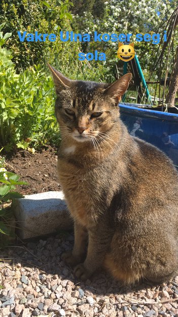 Ulna kom ikke hjem. Vi lurer på om hun ble litt skremt av en valp hjemme, uten at det så slik ut. Hun er vant til hund. Hun er chippet, og er en vakker katt. Blanding av abbyssiner og perser. Hun er ikke særlig kosete av seg. Vi savner henne og vil ha henne hjem