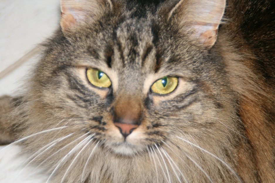 Langhåret stripet brun, svart og orange hunnkatt. Løvemanke og gaupeører. 3 år gammel. Skvetten og noe sky overfor fremmede. Merket med chip.