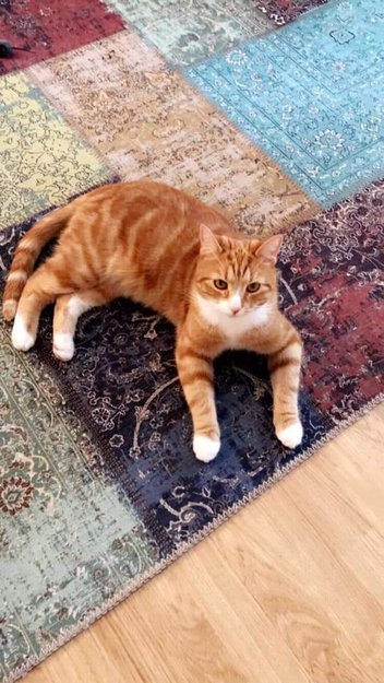 Oransj farge, hals, beina og hender hvite og gule øyner.
