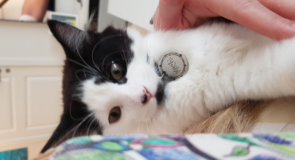 Skipskatt med ekstra tå på potene. Ganske liten og nysgjerrig. Svart hake og svart flekk under nesen. Har halsbånd med navn og telefonnummer