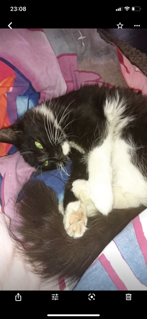 Bamse har litt lang pels, svart/hvit. Er skipskatt, så har xtra poter på alle 4 beina. Veldig kosen. Har en liten hvit stripe på nesa, ikke så veldig markert. Men sees.