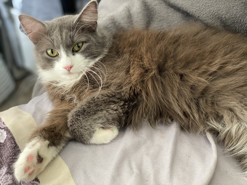 Miss er grå i øverste delen av kroppen og hvit fra munnen til nederste av kroppen. Hun svarer til navnet missy og er veldig sjenert innekatt.
