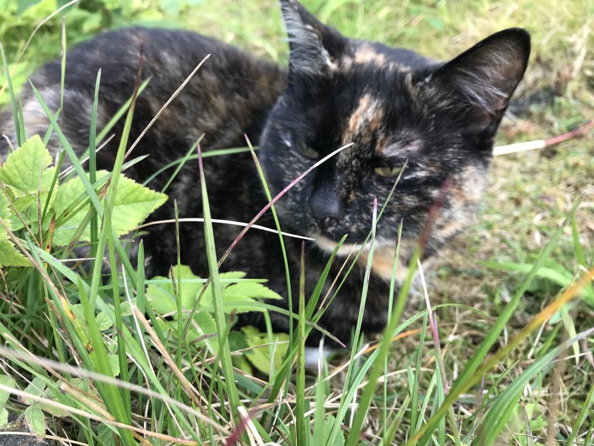 Beige stripe i panna, beige på halsen, veldig lys på haken