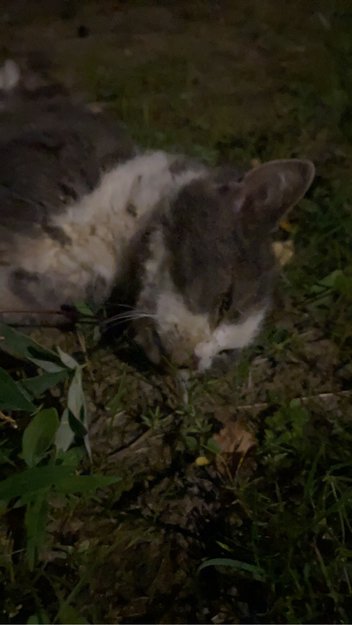 Grå og hvit katt funnet omkommet. Hvit trekant i ansiktet og hvite potet. Chip ikke funnet. Pusen er levert inn til Årnes Veterinær klinikk.