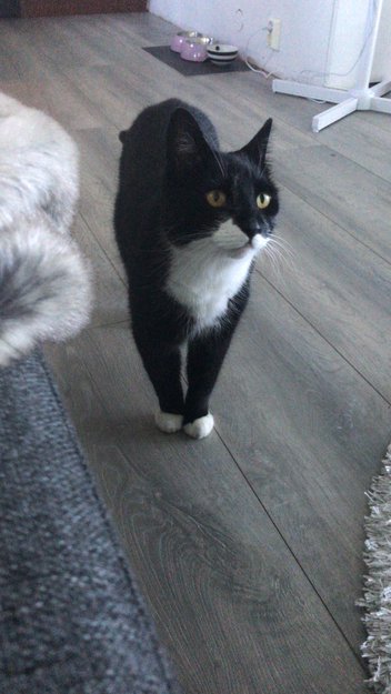 Har hvit pels over høyre snutedel, hvite poter, og hvit mage! Godt matvett, kontaktsøkende og leken. Reagerer på navnet sitt, Miley, og ordet tunfisk.