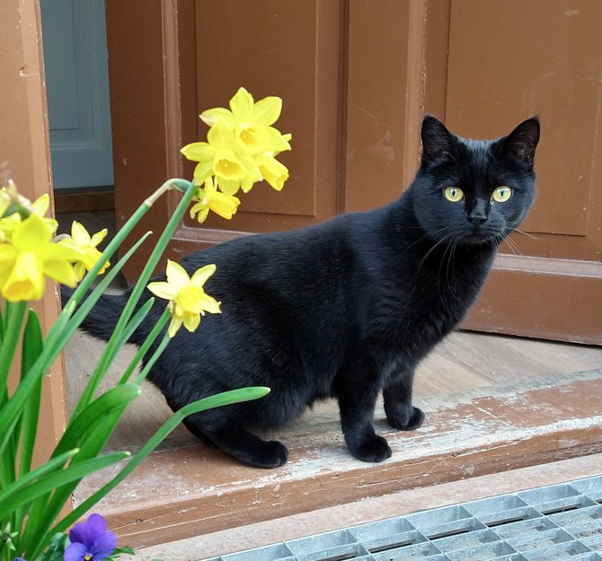 Hun er liten, helsvart med gule øyne og en hvit flekk i det venstre øret. Trolig svært skvetten og sky.