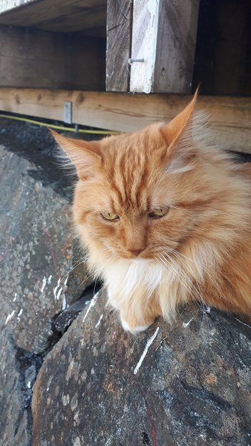 Stor orange katt med noen hvite merker men hvite sokker/potter på alle beina. Hvit under haken. Klare trekk av Norsk Skogkatt og han er ca 7kg