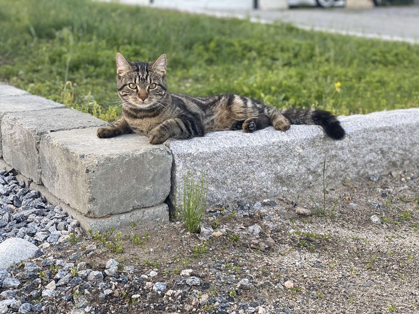 Tydelig mønster i pelsen, svart haletupp. Prikker på magen, tynn og stor. Står ID i øret