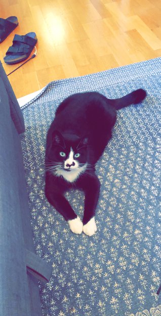 Svart på kroppen. Hvitt bryst og hvite poter. Hvit over nesebeinet, med en liten gjenkjennelig svart «bart» akkurat på snuten. Lysegrønne øyne.