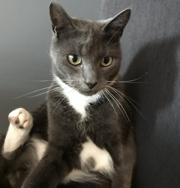 Grå og hvit, kort pels. Hvite sokker og hvit på magen.