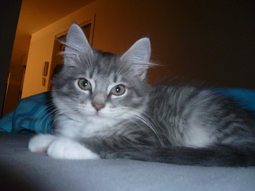 Hun er langhåret med flere nyanser av grått i pelsen. Hun har hvitt bryst og en ”M” i pannen.