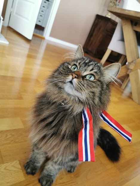 Havgrønne øyne og har lang fluffy pels. Kontaktsøkende og mjauer når hun ønsker oppmerksomhet eller trenger hjelp. Ekstremt kosete og veldig leken pus.
