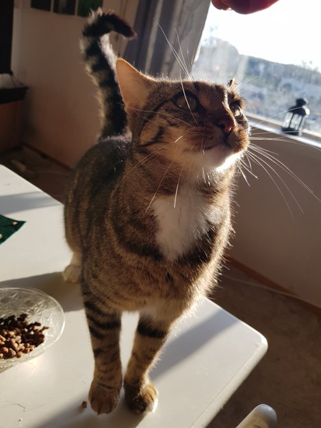 Kvit flekk på brystet og potene. Hun er svært menneskevant og kosen. Hun kjenner navnet sitt.