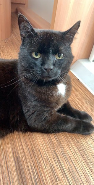 Over gjennomsnittlig stor katt med arr på hodet ved ørene og stor hvit flekk på halsen. Kan oppfattes hjemløs på utseende. Er chippet
