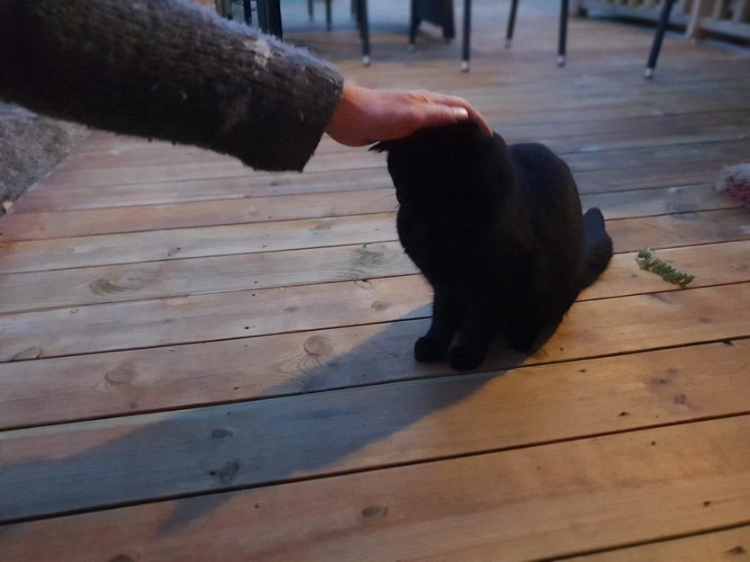 Katten har oppholdt seg i hytteområdet ved Regnbuen, Ormelet. Tydeligvis har ingen matet den, er veldig usultet og tynn. Ikke chippet. Tror det er jente.