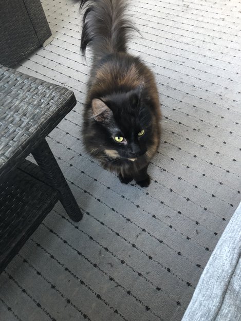 Hun er innekatt. Vi gikk tur med henne ute i bånd, hun ble redd pga. vinden og sleit seg ut av selen hun hadde på seg og sprang bort.