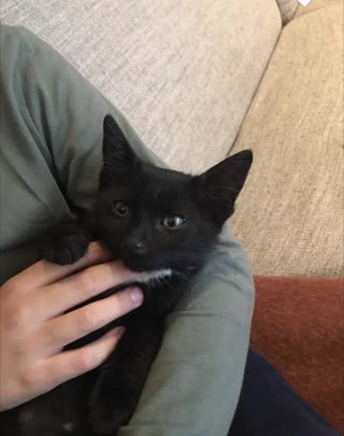 Katten er helt sort med en hvit flekk på halsen. Den er 5 mnd gammel. Den er kjent i området og har katteluke. Den har bare forsvunnet.