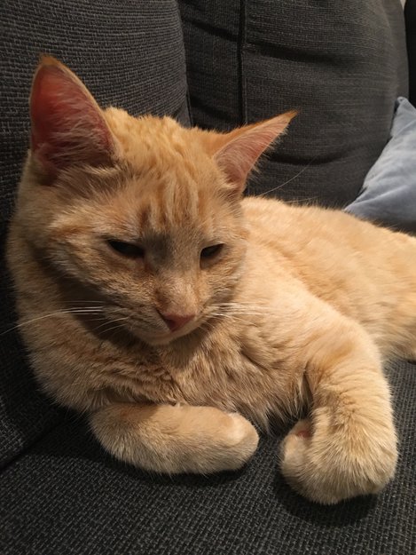 Lys oransje, slank, sterilisert hunnkatt på to år med «leopardprikker» på magen.Er ikke glad i å bli løftet, men liker å rulle på bakken i sola, er sosial og glad i mennesker. Har tatovering i øret (bokstavene ID)