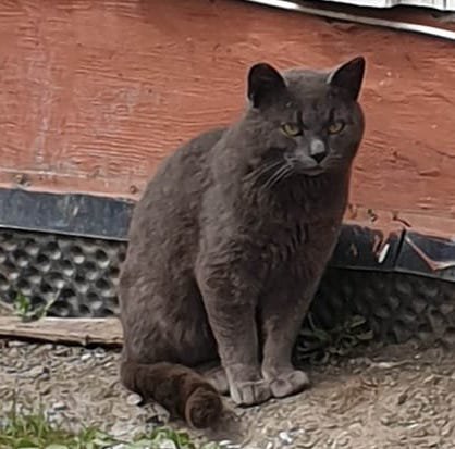 Katten kom i midten av juni 2020. Går inn og spiser mat til katt som bor der. Den er sky men den lar seg klappe.