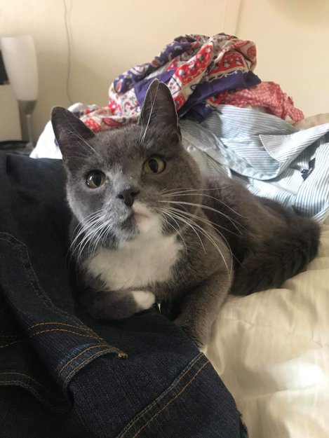 En voksen katt, men ganske liten. Er sky og ganske kresen i matveien. Hvitt bryst og hvite forlabber.