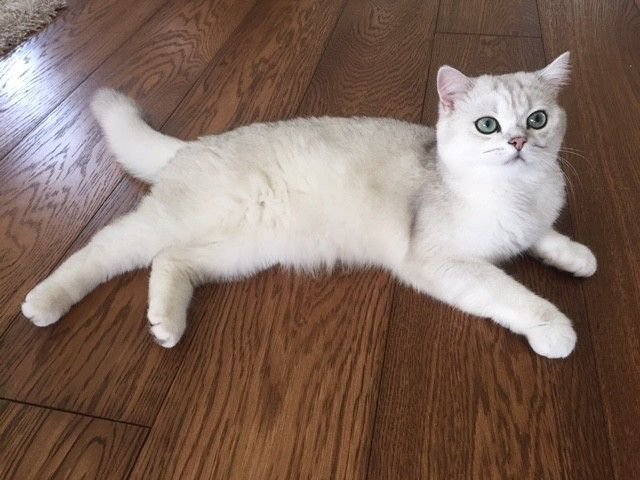 Hvit med store grønne øyne.