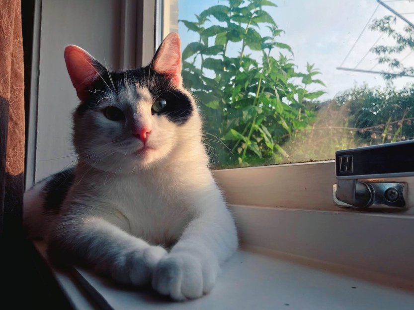 Kun sort over det ene øyet (se bildet). Rosa nese. Kastrert.