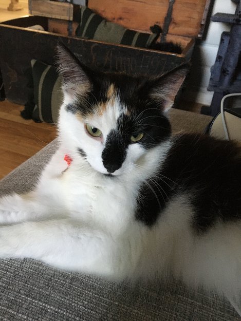 Svart over det ene øyet, svært tillitsfull og vennlig, «kattunge-stemme»