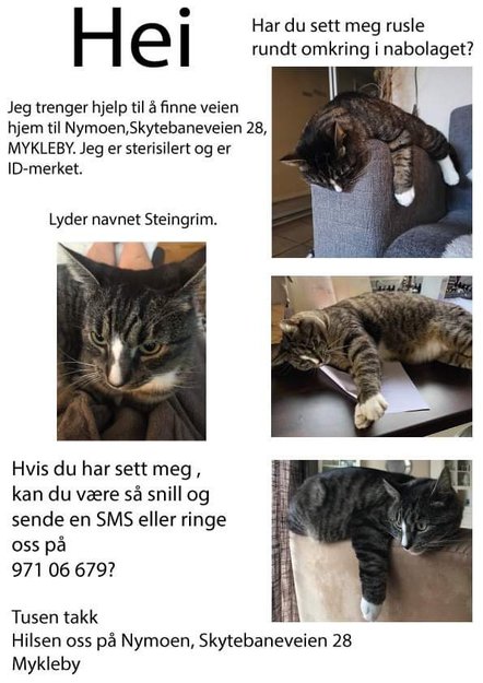 Vi var på ferie hos min sønn med våre 2 katter, søsken. De 2 siste ukene i juni13-28/6-2020. Søsteren Nala var borte i ca 3 uker, men er nå kommet tilrette. Steingrim ble borte noen dager før vi reiste hjem. Han er fortsatt borte og har ikke vært observert hos min sønn. Vi har hengt opp plakater i nærmiljø og snakket med naboer, og lett, uten resultat. Han kjenner godt de som bor i Skytebaneveien.