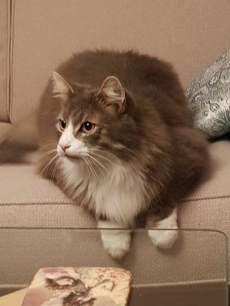 Kjennetegn, hvit haletipp. Han har trukket fortennene på venstre side. Ikke spesielt lett å komme i kontakt med. Er chippet. Stor hannkatt silkemyk pels.