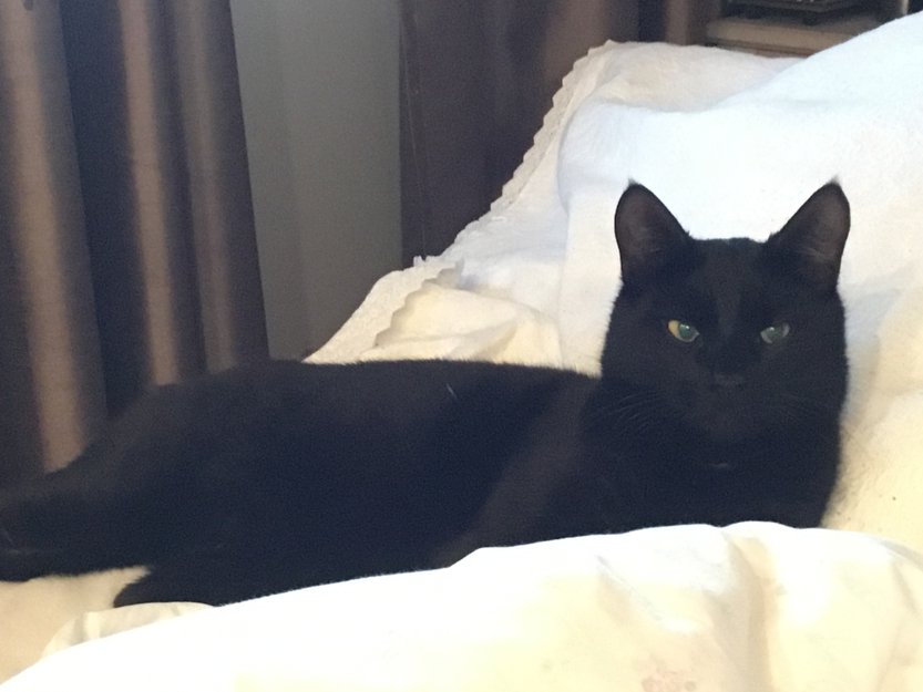 Liten hvit flekk på brystet. Veldig kosete. Liker ikke hoppe ned fra høyder.