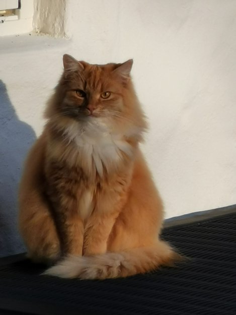 Har blanding av oransje og hvit farge. Potene er mest hvite og halsen er helt hvit. Er sky for fremmede. Lyder navnet Simba. Han er ID merka i øret. Har lang pels over det hele.